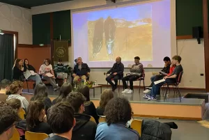 L’incontro è iniziato con l’intervento del dirigente, prof. Giuseppe Scafuro, che ha ricordato una frase del Cardinal Martini: “Educare è come seminare: il frutto non è garantito e non è immediato, ma se non si semina, è certo che non ci sarà raccolto”. Il dialogo è scaturito grazie al gruppo di IRC della classe terza, che, sotto la guida della prof.ssa Cogliati, ha elaborato e presentato la poesia “L’educazione tiene a me”: “se mi insegni io imparo / se mi parli mi è più chiaro / se lo fai mi entra in testa / se non mi entra per favore resta”. Il testo, dal ritmo sincopato, ha permesso a don Claudio di raccontare la storia di Baby gang e affrontare il tema della musica rap e trap, indicandola come uno strumento utile ai giovani per esprimere il loro disagio e cercare di raggiungere un sogno. “Inseguite i vostri sogni, i vostri desideri”, ha suggerito l’ospite.